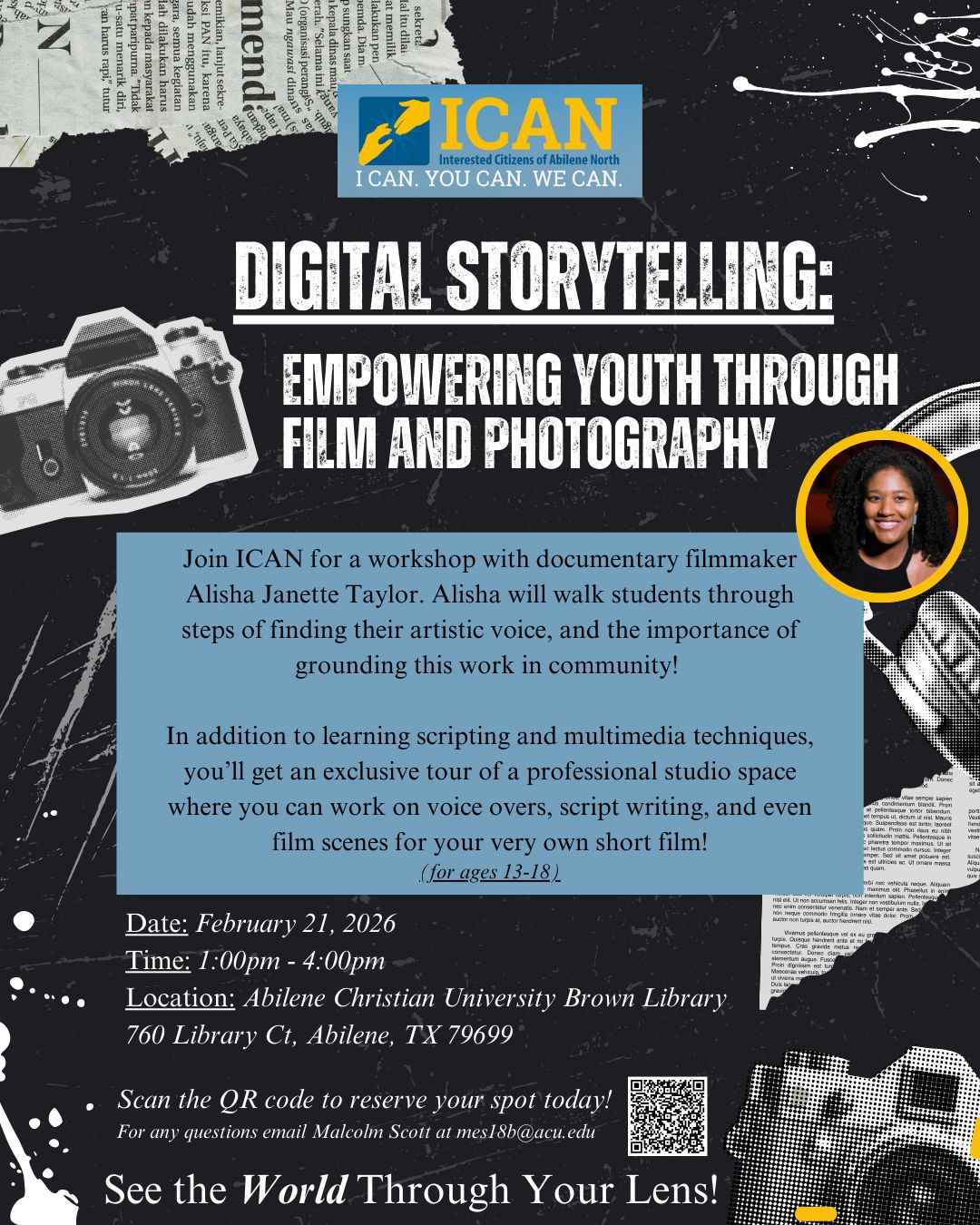 Abilene Christian University 1600 Campus Ct, AbileneJoin ICAN for a workshop with documentary filmmaker Alisha Janette Taylor Date: February 21, 2026 Time: 1:00 pm - 4:00pm Location: Abilene Christian University Brown Library 760 Library Ct. Abilene, TX 79699