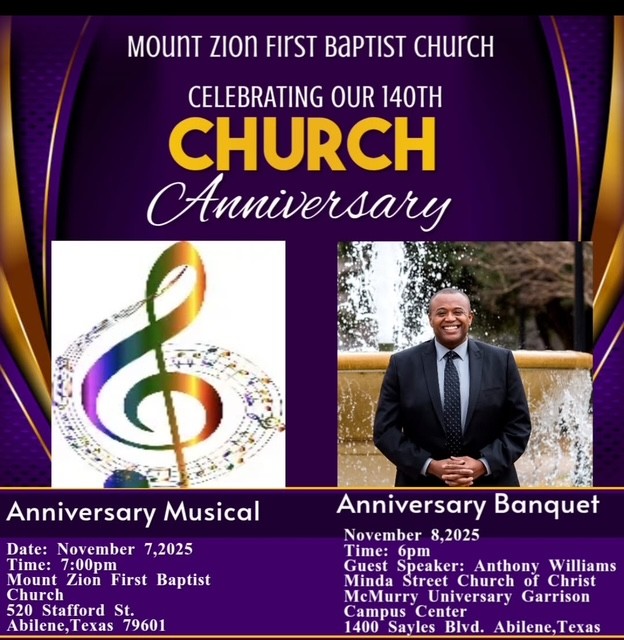McMurry University 1400 Sayles Blvd, Abilene, TX, United StatesMOUNT ZION FIRST BAPTIST CHURCH CELEBRATING THEIR 140TH CHURCH ANNIVERSARY ANNIVERSARY MUSICAL ON November 7, 2025 ANNIVERSARY BANQUET ON November 8, 2025 SPEAKER: ANTHONY WILLIAMS See flyer attached for details…