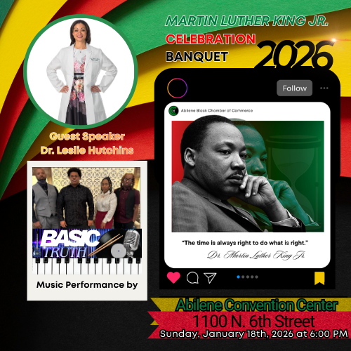 Abilene Convention Center 1100 N 6th St, Abilene, TX, United StatesThe Abilene Black Chamber of Commerce will be celebrating its 32nd annual Martin Luther King Jr. banquet on SUNDAY, JANUARY 18, 2026, at the Abilene Convention Center located at 1100…
